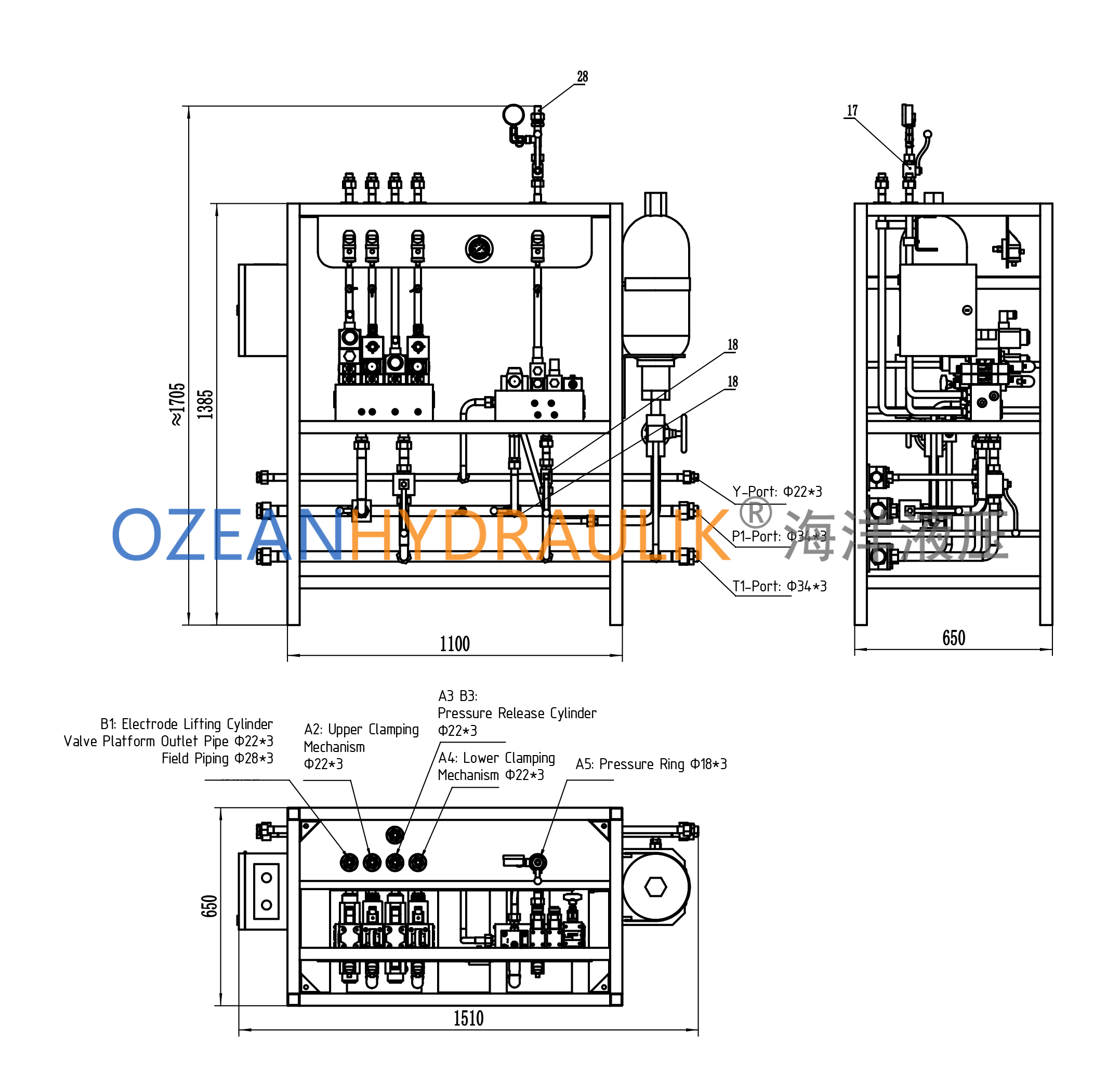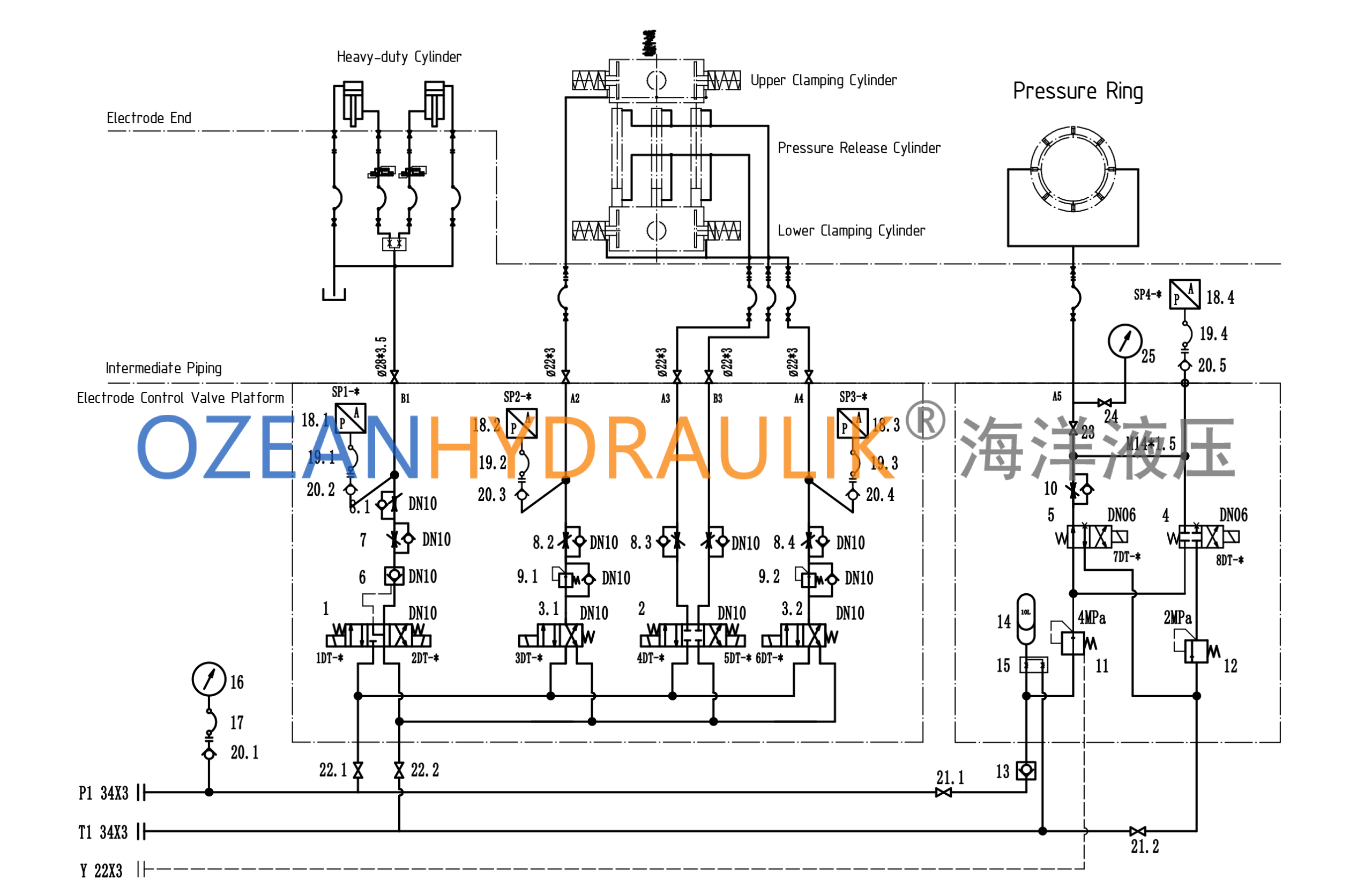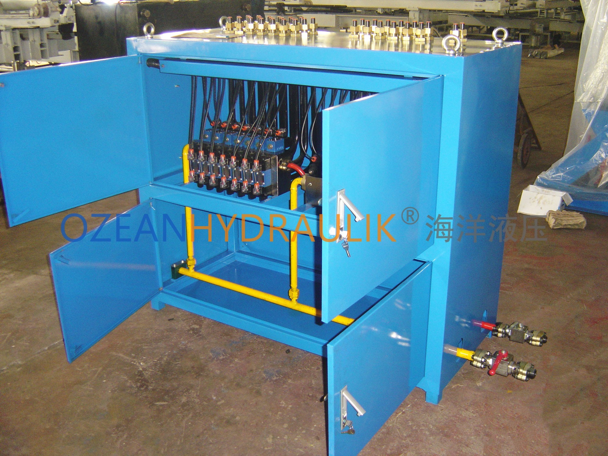 The electrode control valve station is composed of a fully enclosed valve box, hydraulic valve groups, pressure gauges, digital pressure transmitters, internal hydraulic pipelines (304 stainless steel), high-pressure ball valves, electrical terminal boxes, etc., and is used to control hydraulic equipment.