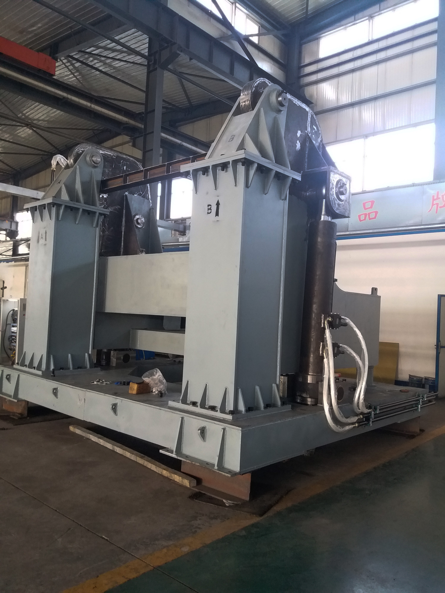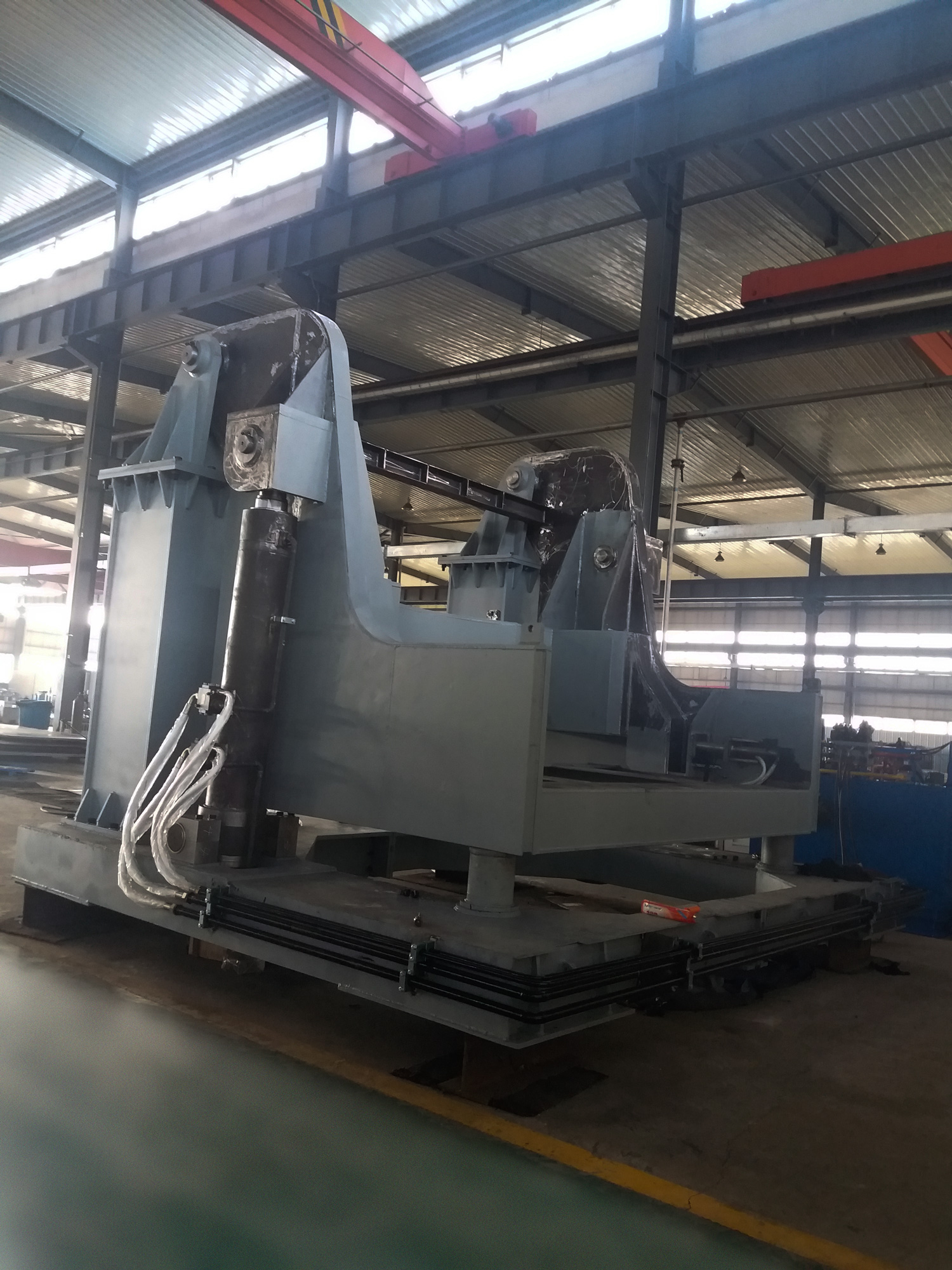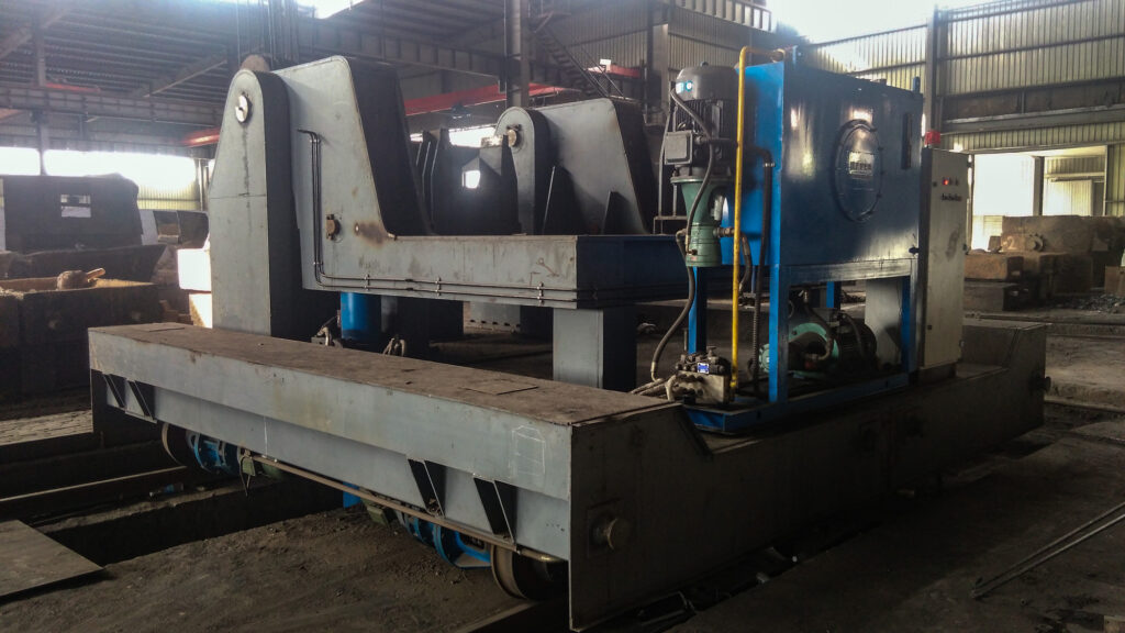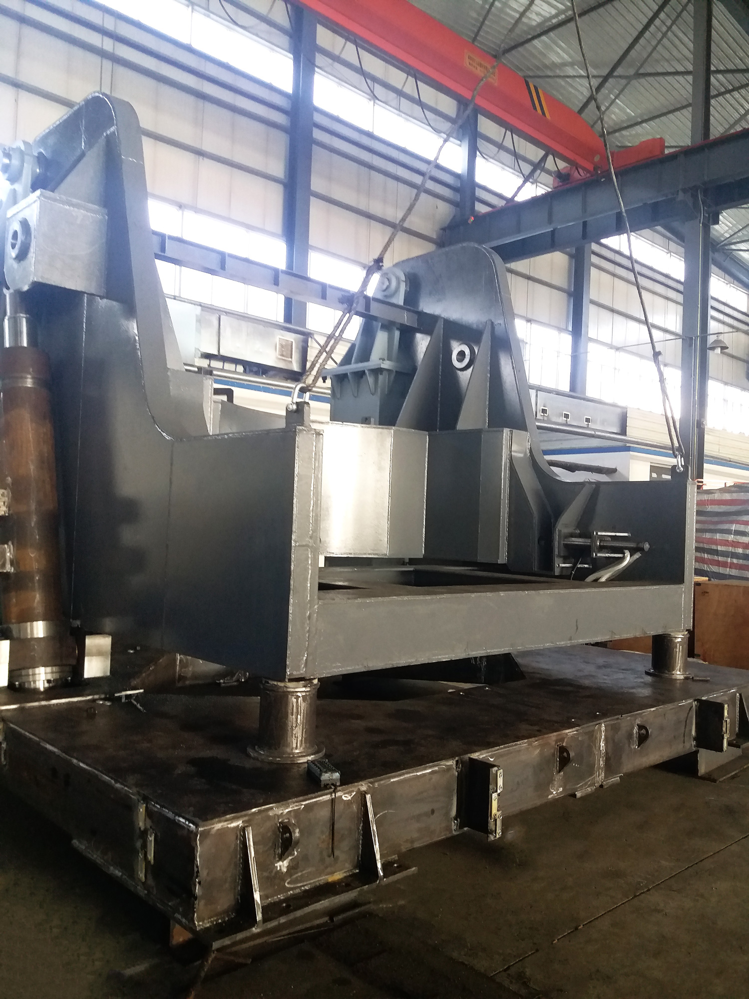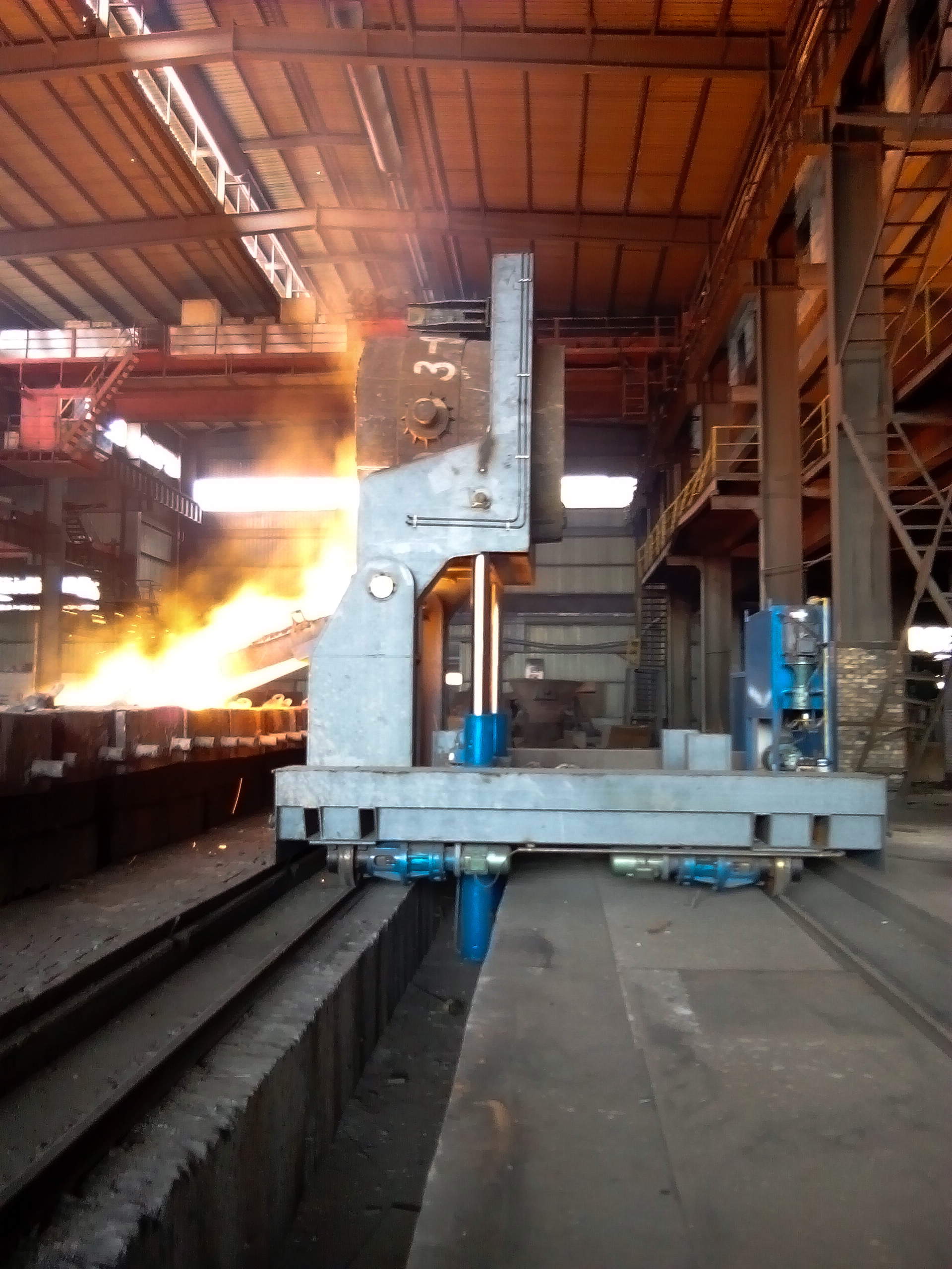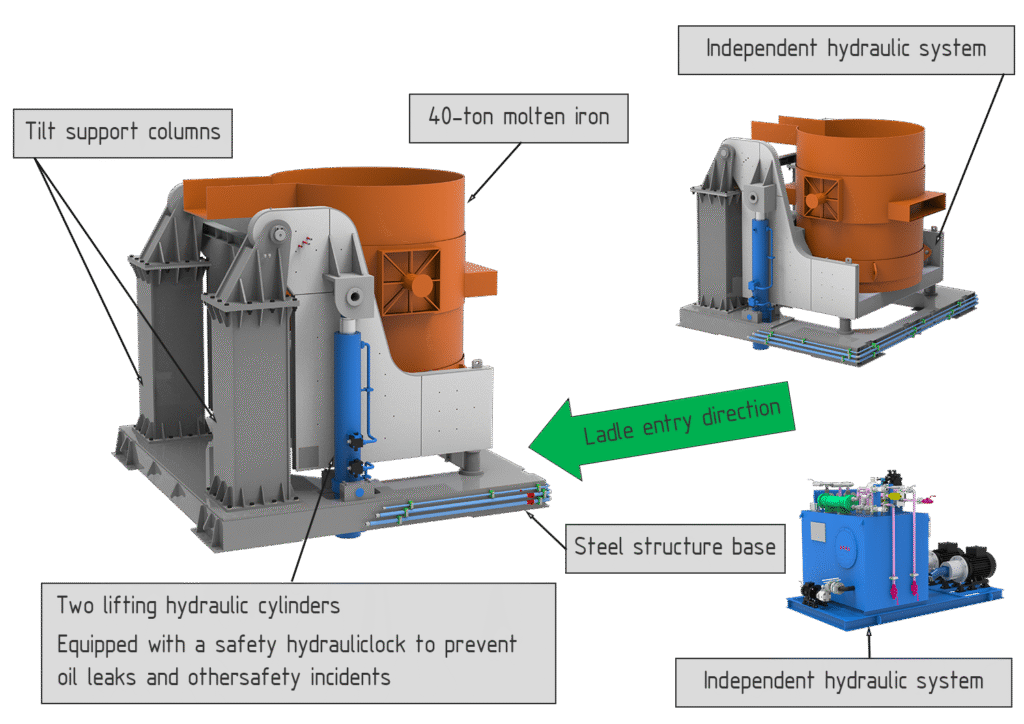The ladle tilting machine utilizes hydraulic cylinders to tilt the ladle of molten iron.