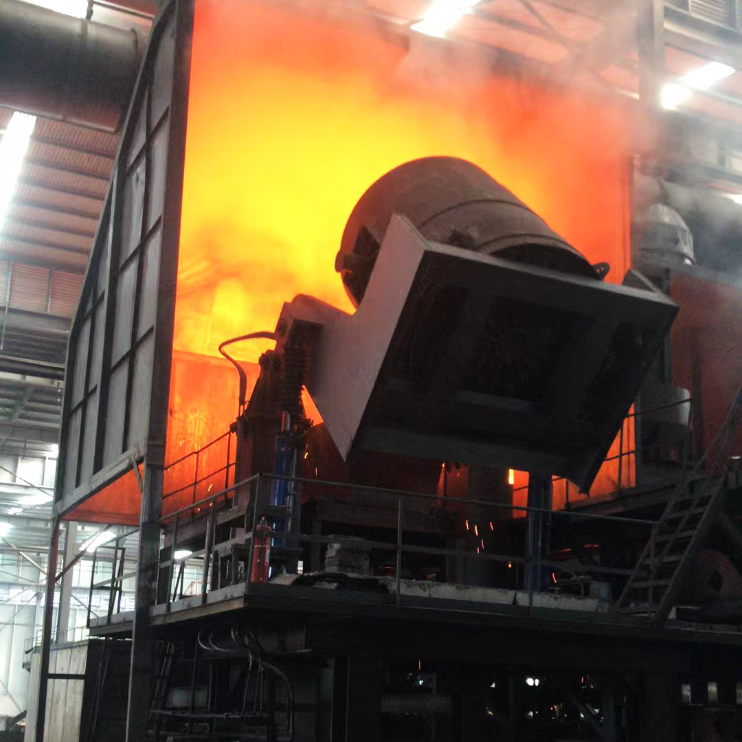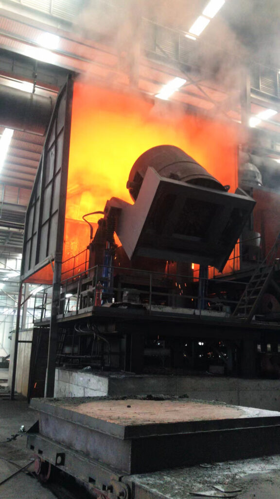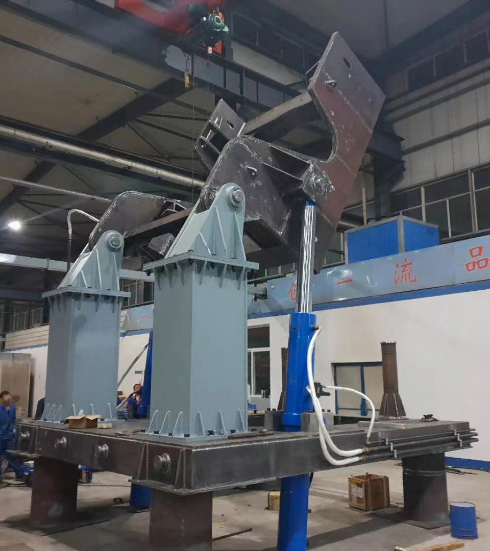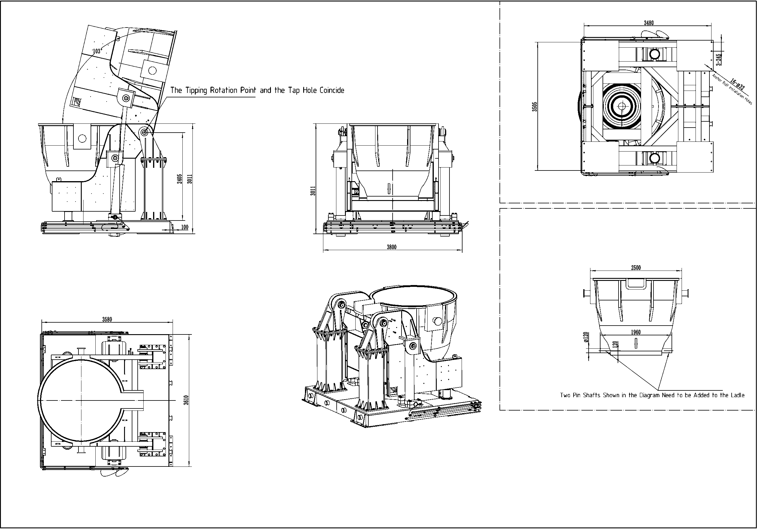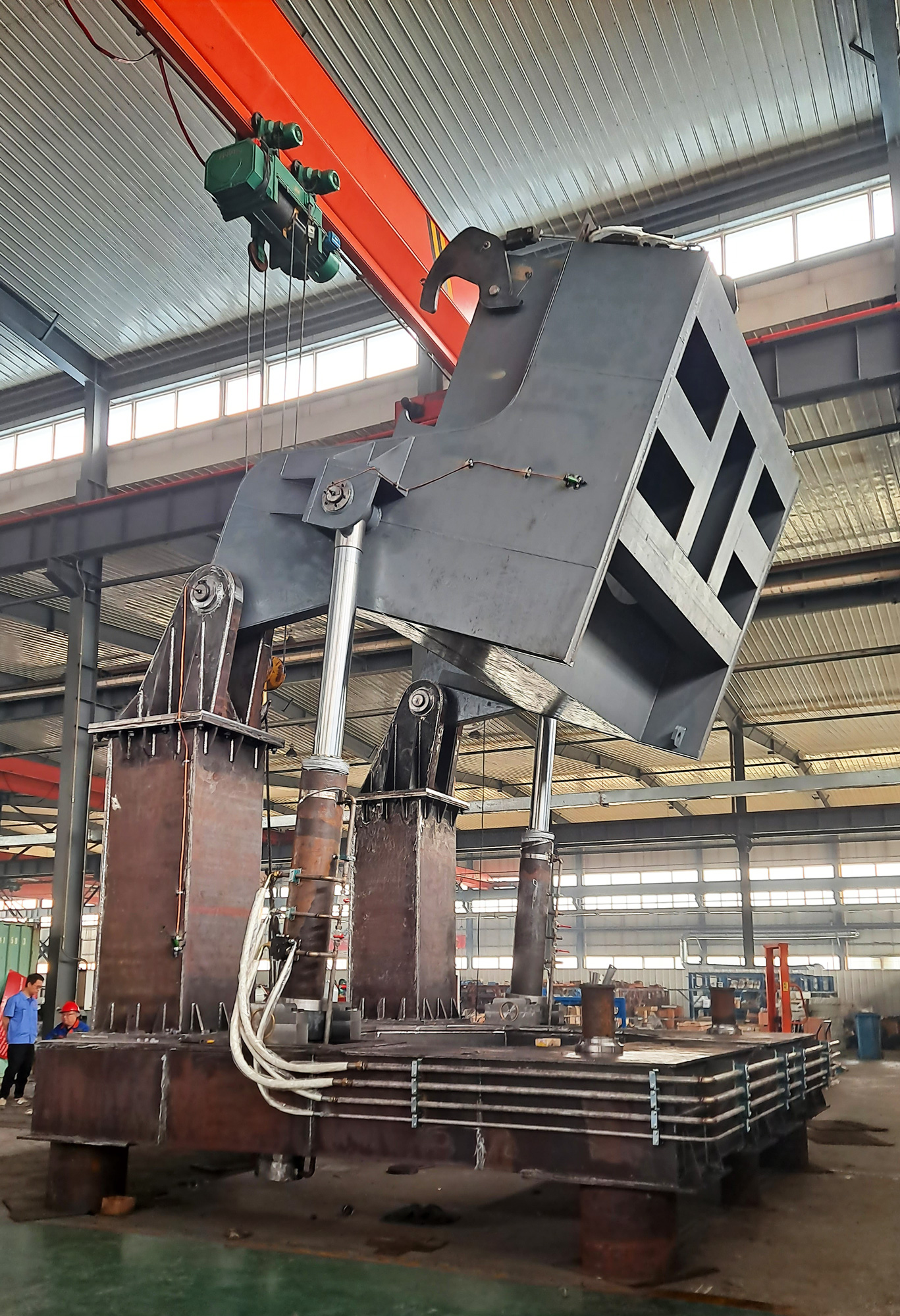 The ladle tilting machine utilizes hydraulic cylinders to tilt the ladle of molten iron.
