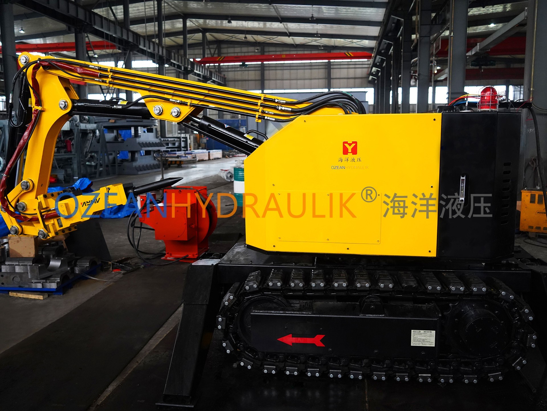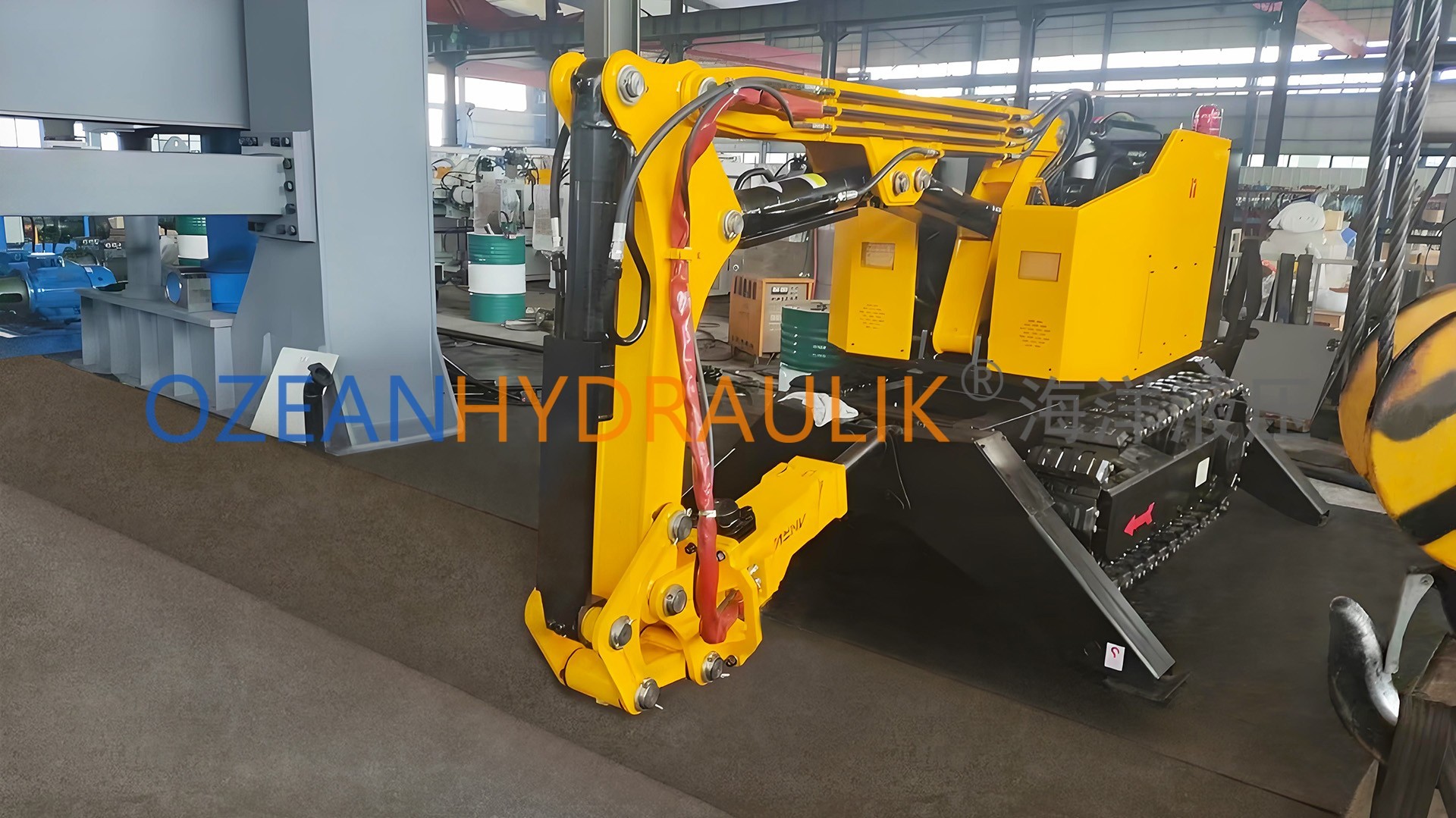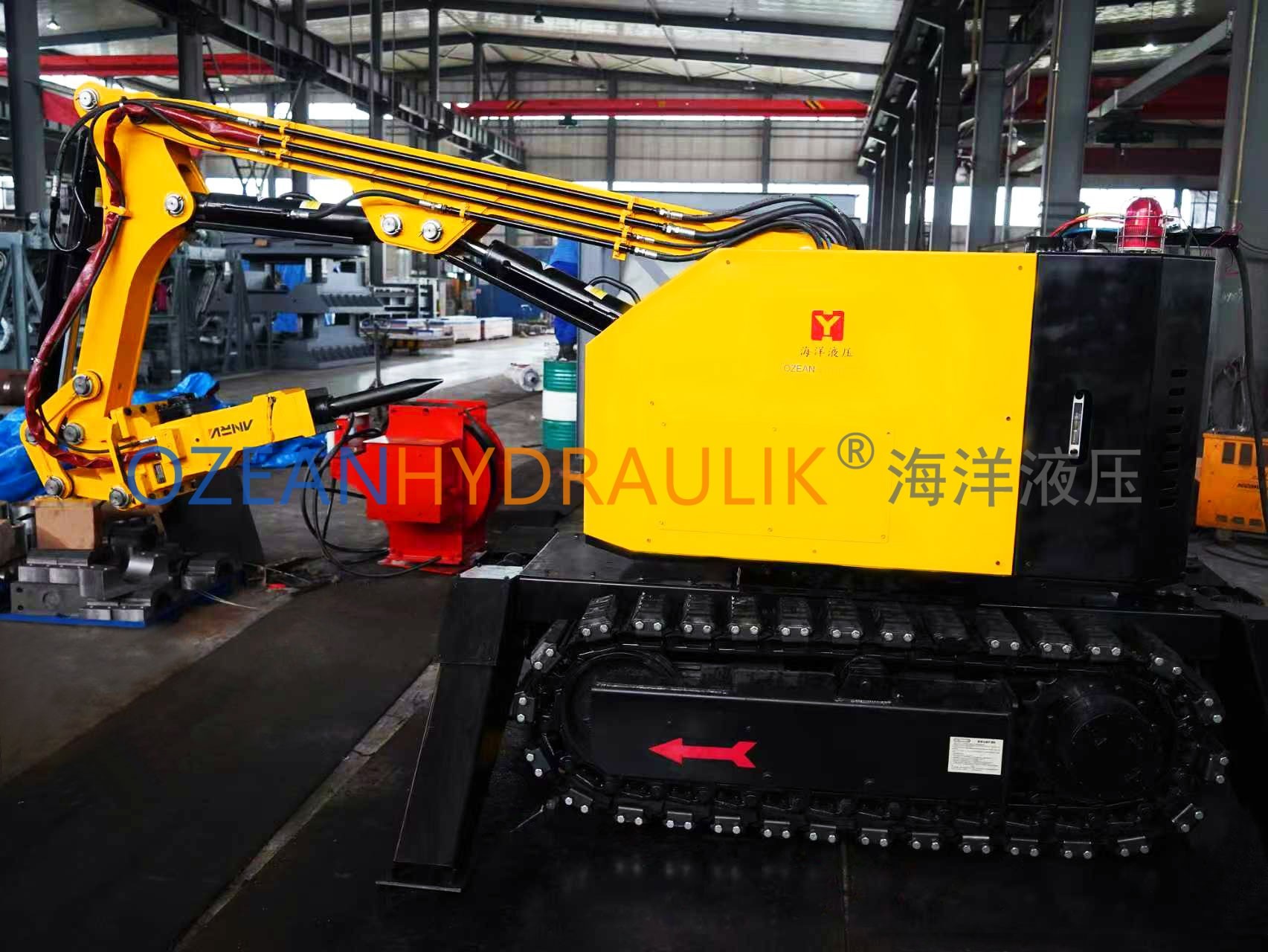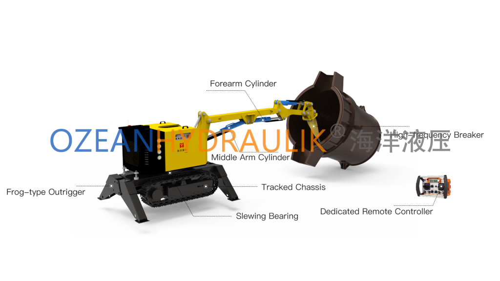 Tundish Deslagging Robot is a fully hydraulic, wirelessly remote-controlled, tracked self-propelled robot. Its flexible mechanical arm, combined with tools such as hydraulic hammers, slag removal hammers, excavation buckets, hydraulic shears, and hydraulic grabs, enables it to perform various construction tasks. The equipment is powered by a diesel internal combustion engine. Featuring a compact design, easy mobility, and the ability to maneuver flexibly in confined spaces, it is particularly suitable for operation in limited areas.