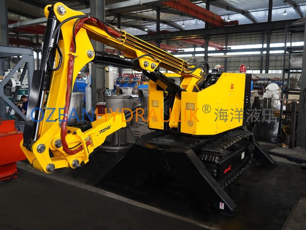 Tundish Deslagging Robot is a fully hydraulic, wirelessly remote-controlled, tracked self-propelled robot. Its flexible mechanical arm, combined with tools such as hydraulic hammers, slag removal hammers, excavation buckets, hydraulic shears, and hydraulic grabs, enables it to perform various construction tasks. The equipment is powered by a diesel internal combustion engine. Featuring a compact design, easy mobility, and the ability to maneuver flexibly in confined spaces, it is particularly suitable for operation in limited areas.