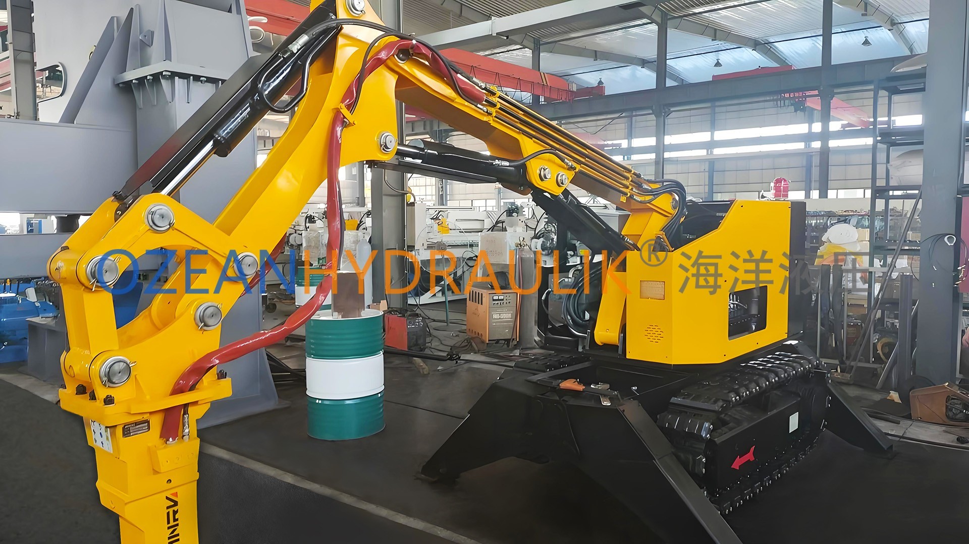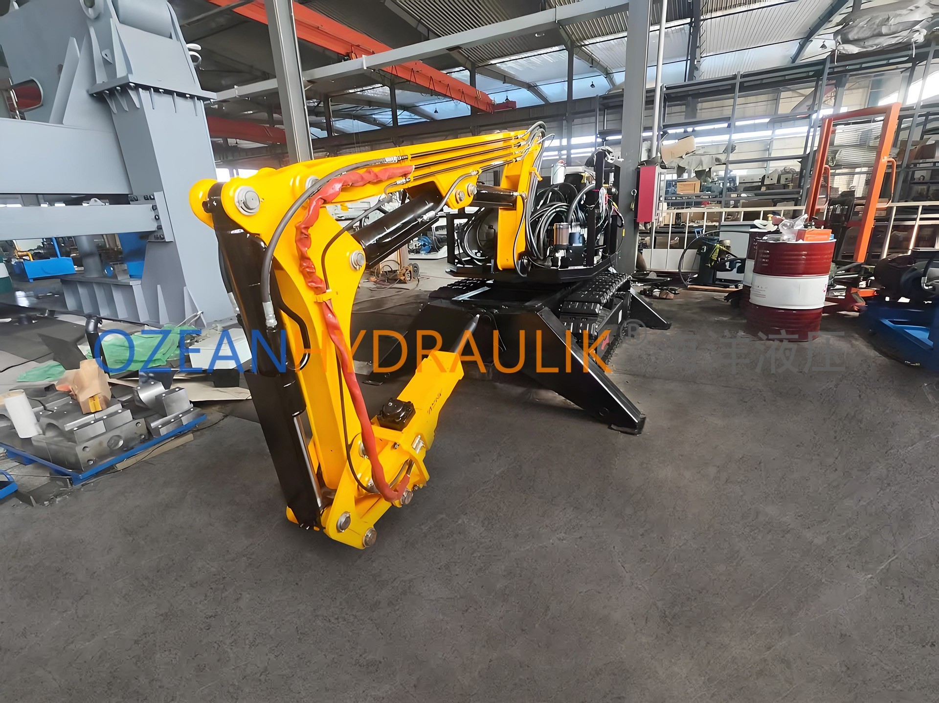 Tundish Deslagging Robot is a fully hydraulic, wirelessly remote-controlled, tracked self-propelled robot. Its flexible mechanical arm, combined with tools such as hydraulic hammers, slag removal hammers, excavation buckets, hydraulic shears, and hydraulic grabs, enables it to perform various construction tasks. The equipment is powered by a diesel internal combustion engine. Featuring a compact design, easy mobility, and the ability to maneuver flexibly in confined spaces, it is particularly suitable for operation in limited areas.